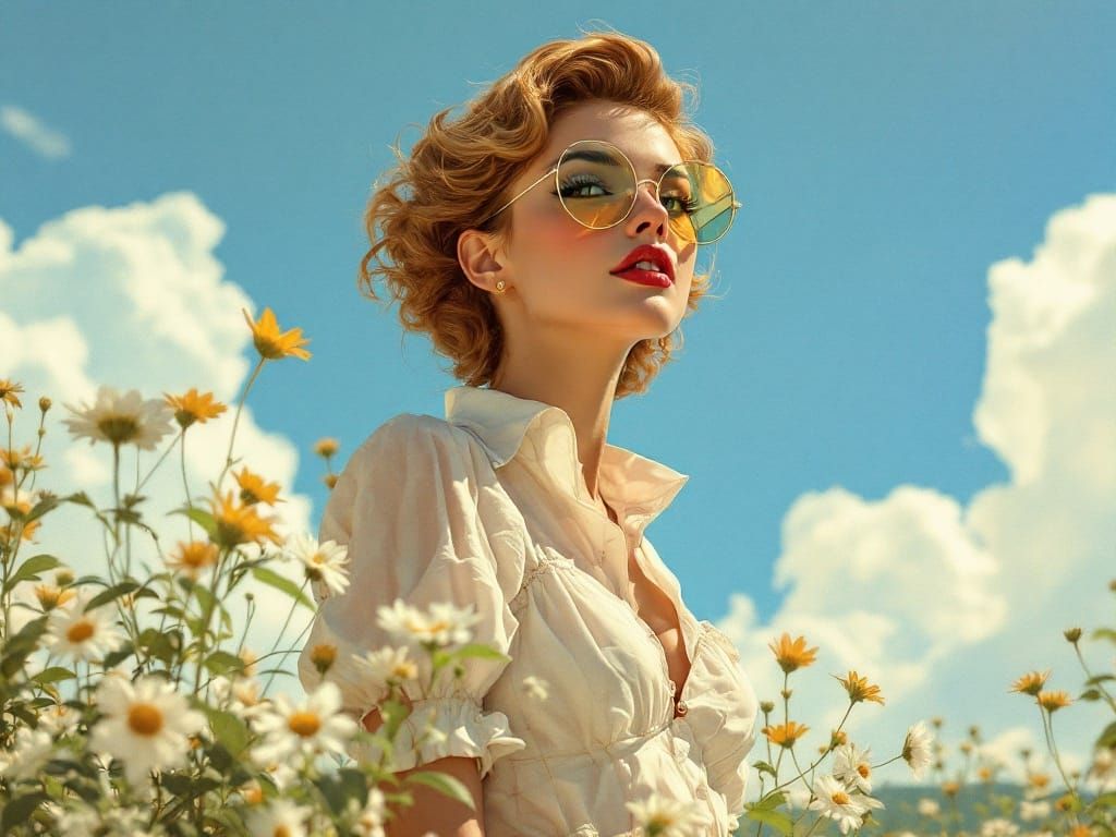 This image features a stunning, full-body pin-up woman standing confidently, surrounded by a gradient sky with dappled natural light effects. The artwork combines classic pin-up style with sustainable futurism, incorporating botanical motifs and contemporary color harmonies to evoke a sense of optimism a...