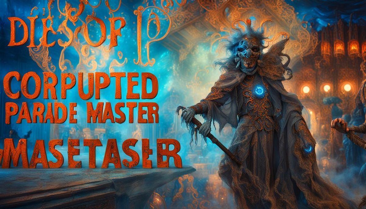 This image shows a hauntingly beautiful portrait of a corrupted parade master, set against a twisted carnival backdrop. Rich, detailed textures and vibrant, complementary colors create a captivating, otherworldly atmosphere.
