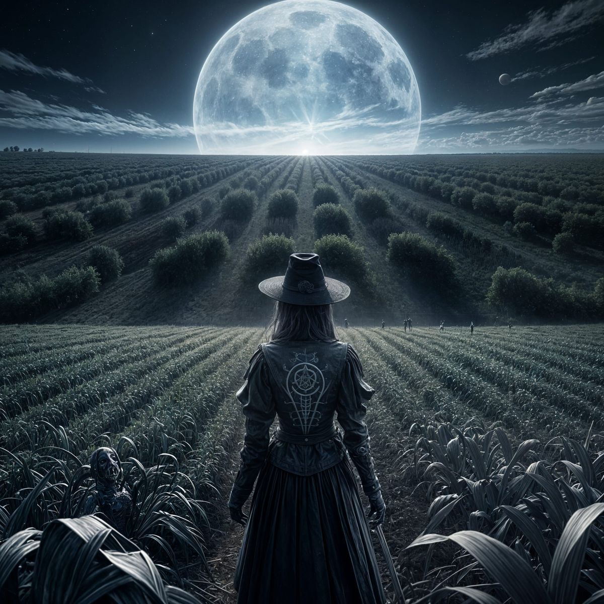 This 3D anime art depicts a terrifying harvest festival with ghosts, witches, and zombie farmers. Ethereal binary code swirls around spectral forms under vivid moonlight.