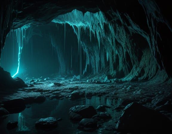 This hyperrealistic 8K oil painting depicts a creature ensnared in luminous, sinewy webs within a dark cave. Eerie phosphorescent light illuminates the scene, highlighting the desperation and gothic atmosphere.