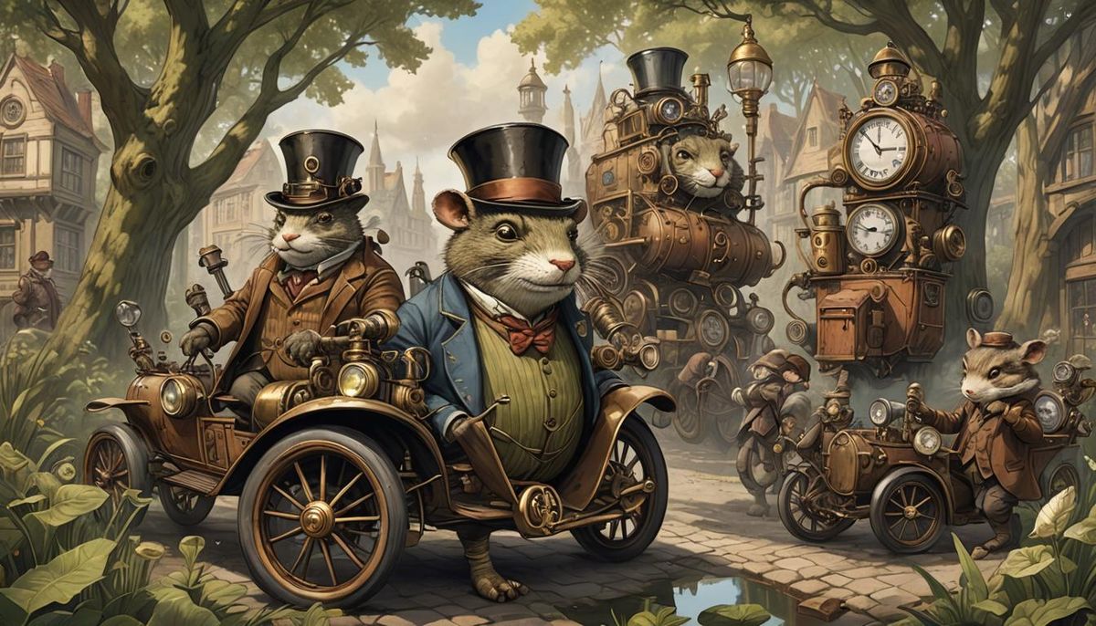 This image shows a steampunk interpretation of "Wind in the Willows". The scene evokes a nostalgic, fantastical atmosphere with mechanical and Victorian elements.