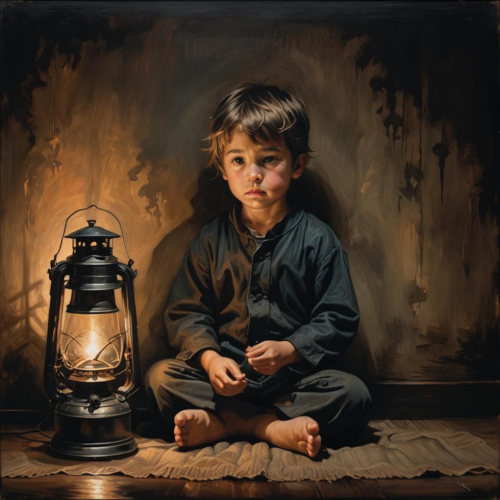 This image shows a child sitting near a lantern in a dark room, illuminated by the lantern's soft glow. The scene is rendered with muted colors, bold outlines, and ominous shadows, creating a haunting atmosphere reminiscent of Fauvist expressionism.