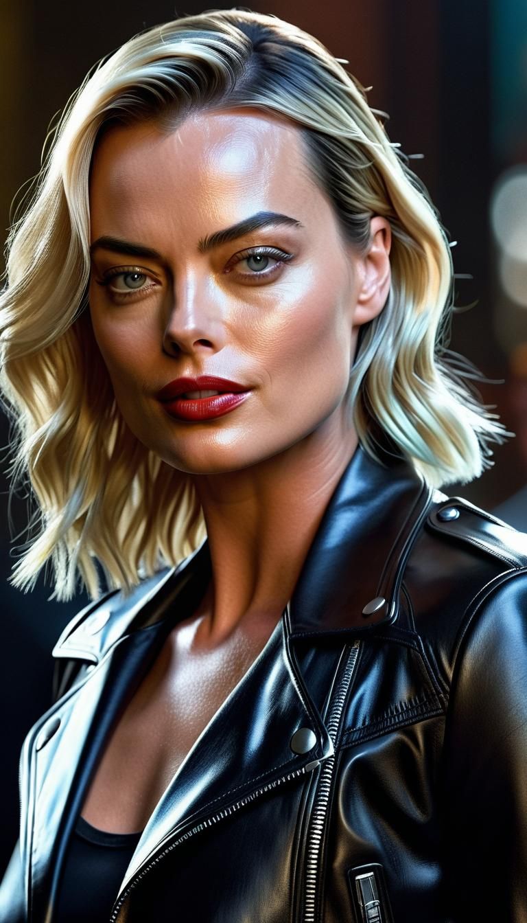This image shows a realistic full-body view of a 25-year-old woman in a leather suit, jacket, and pants, set in an action movie scene. The portrait features dynamic lighting and ultra HD quality.