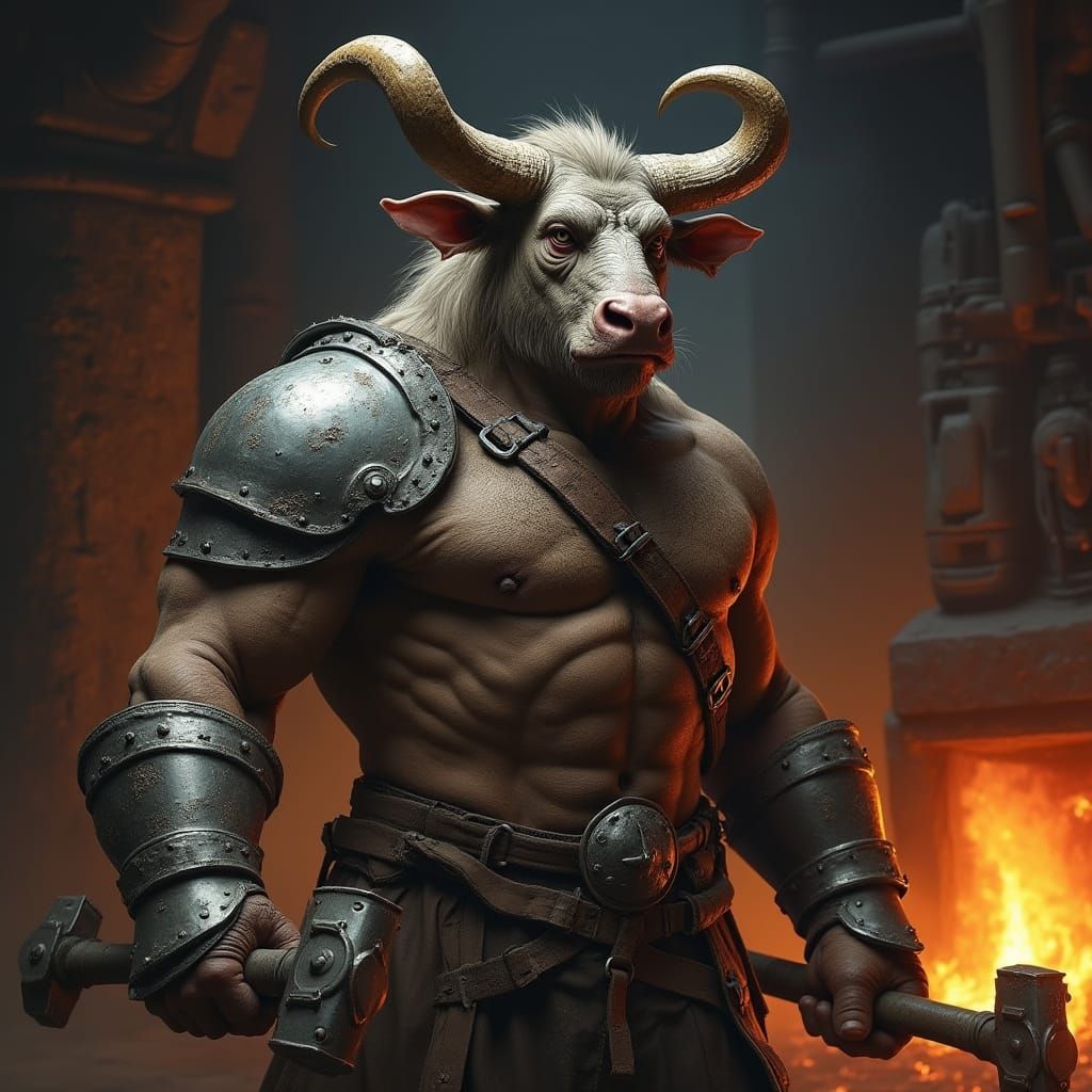 This image depicts a rugged, aged Minotaur blacksmith, proudly standing in a dimly lit forge, surrounded by the warm glow of molten metal and the earthy feel of his weathered fur. His suit of leather armour and massive throwing hammers reflect his skill and prowess in battle, while his single, curved hor...