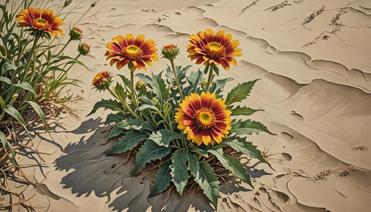 This image shows a detailed oil painting of a Blanket Flower growing on a sandy coastal dune. The vintage aesthetic evokes a sense of nostalgia and timeless beauty.