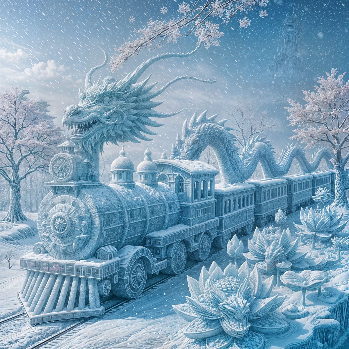 In the distance A ice dragon head on the front of a ice train, pulling behind ice dragon body parts like a long Chinese dragon on the carriages. Detailed snow flakes fly gently out the chimney of the train. it passes sculptures of ice lotus and ice cherry blossom trees. The ground is soft and snowy.