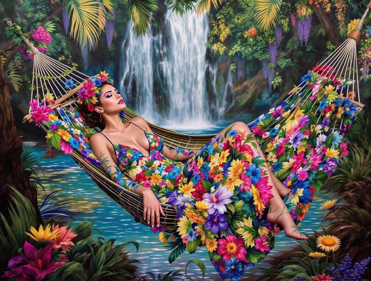 This image captures a serene woman in a lush, tropical setting, surrounded by a majestic waterfall and vibrant, textured floral body paint, blending seamlessly with her dress, in a surrealist style reminiscent of Remedios Varo and Mark Ryden, with hyperdetailed realism