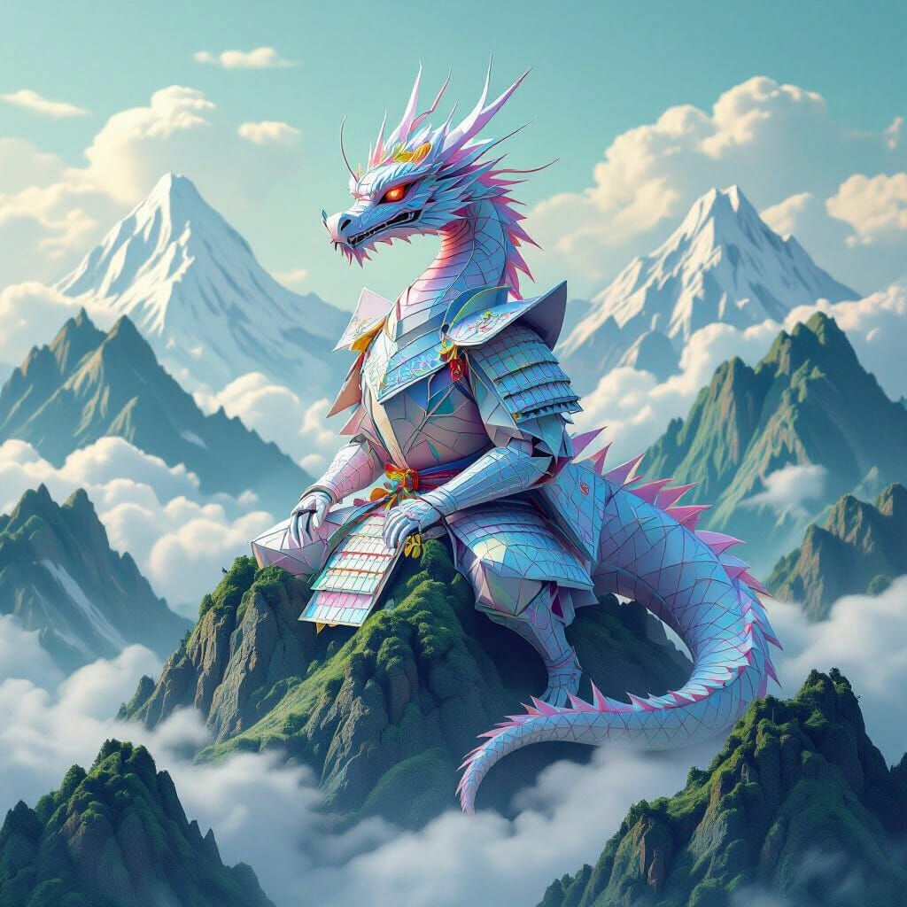 A striking picture of a CGI origami dragon in samurai armor perched high in the mountains. The artwork blends traditional Japanese art with neon-lit futurism.