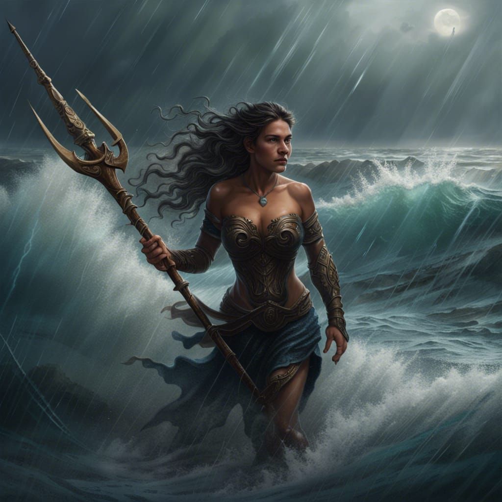 A vivid image of a goddess emerging from a stormy ocean, wielding a trident. The artwork uses dynamic lighting and complementary purple and yellow colors to create a hyperdetailed, fantasy scene.