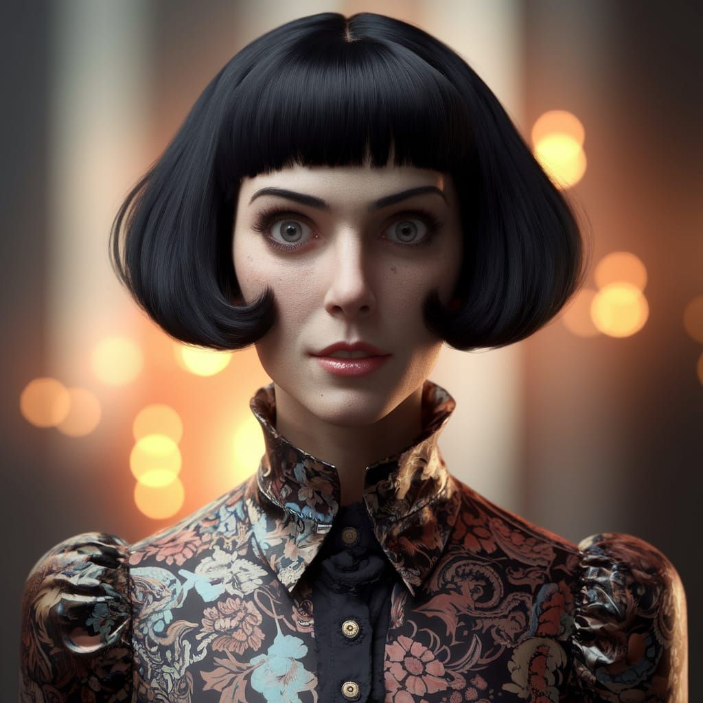 This image is a portrait of a short-haired Victorian woman with a captivating gaze, set against a warm-toned background with intricate patterns and vivid triadic colors.