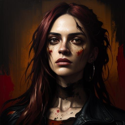 This intense portrait features a woman with striking eyes, set against a dark canvas backdrop of rich, bold colors and textured brushwork, creating a captivating and emotive scene.
