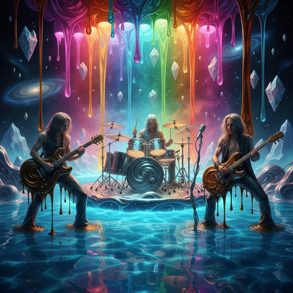 This hyperreal image captures a rock band performing on a psychedelic stage. Instruments are made of liquid silver and motor oil, under dripping, rainbow lighting, in a vibrant, cinematic style.