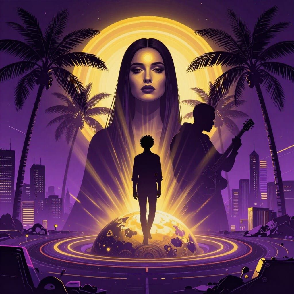 syncopated vertex of vectorial palms trees flying over planet with gold rainbow disc for glowing up crystal cats. advertising for synthwave various jazz black man, opening her third eye in front face beautiful armenian woman with ultra straight hair, very connected spiritual, only bicromic, silouette, ...