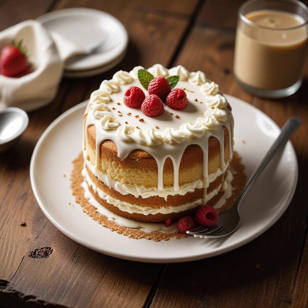 This image showcases a classic dessert in a modern food photography style. A mini cake with smooth frosting sits on a simple white plate, surrounded by warm, soft lighting. The sepia tone and subtle film grain evoke a film noir aesthetic, highlighting the detailed textures and high contrast of the moist ...