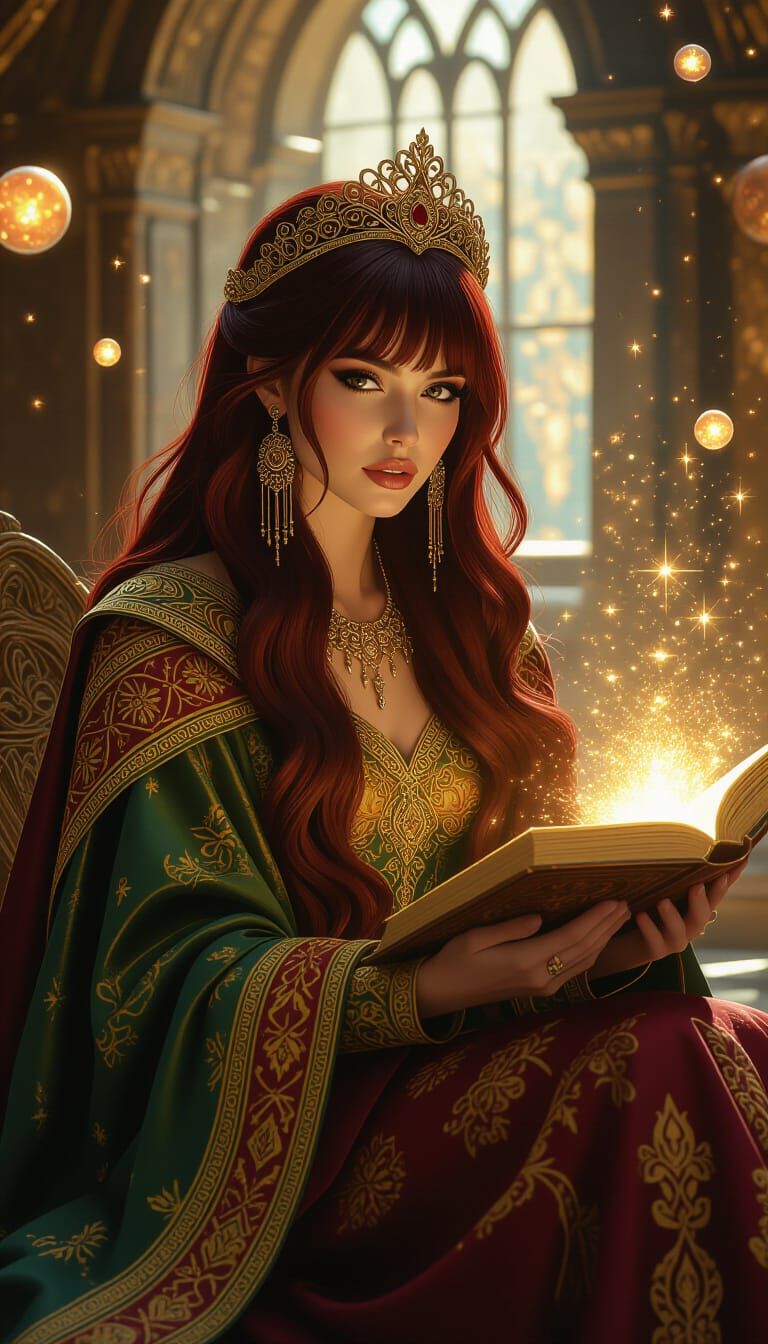This image shows a mystical woman with flowing burgundy hair and golden headdress, seated by an ancient book glowing with light. She is adorned in a richly decorated cloak with intricate patterns and surrounded by floating stars in a painterly fantasy art style.