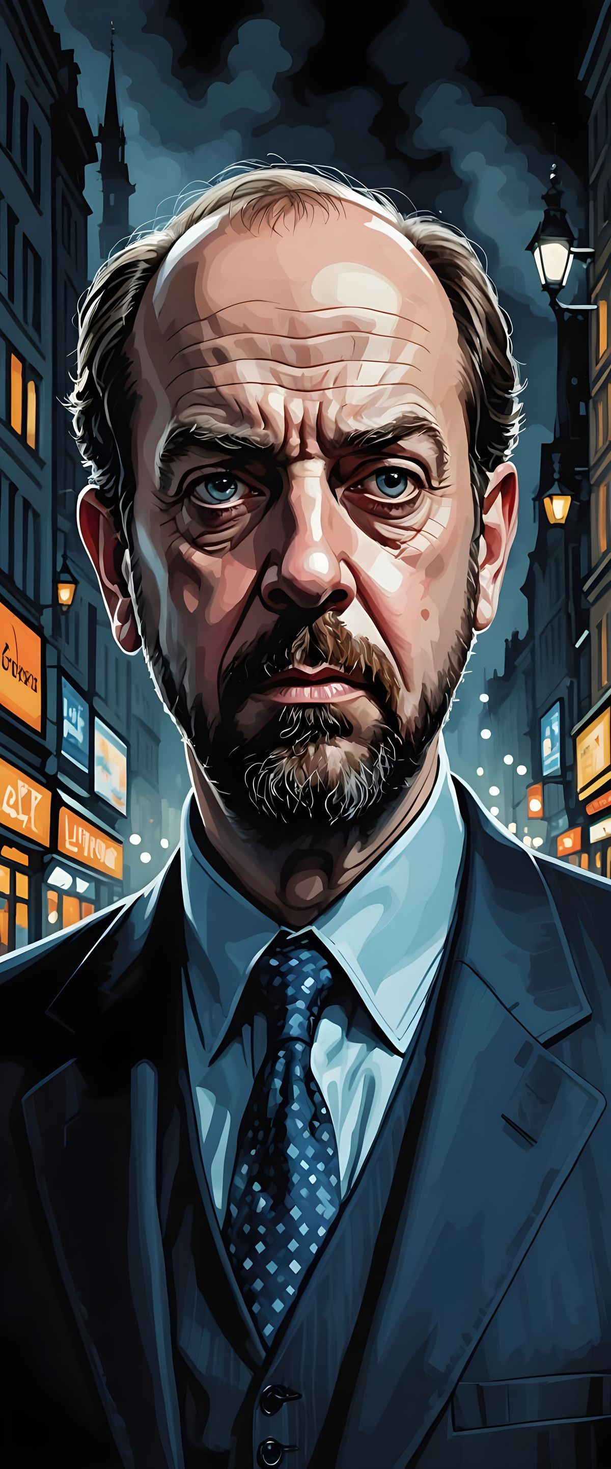 This image shows a fifty-year-old Caucasian man resembling Paul Giamatti, portrayed as a wealthy, stern, and corrupt politician. The scene is set in a dark, mysterious Prague at night, with a noir photogram aesthetic.