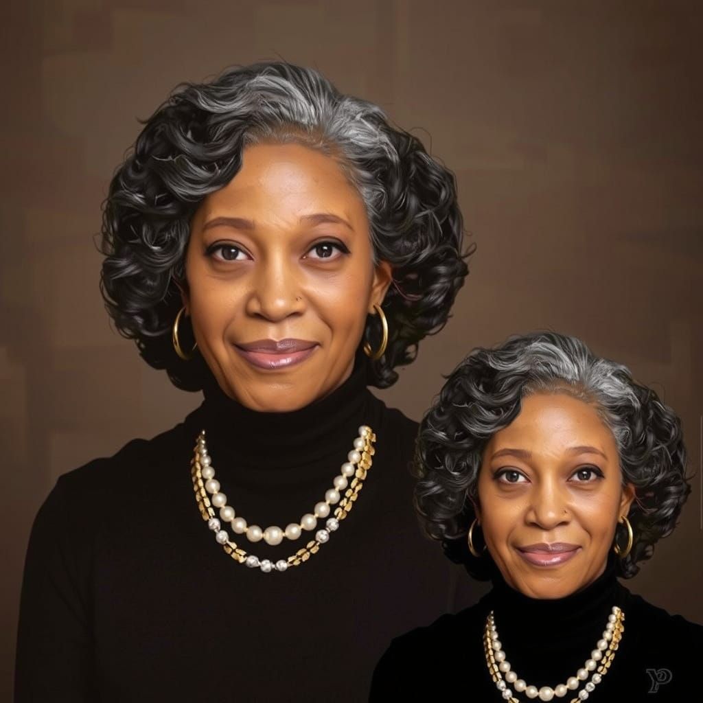 This image shows a photorealistic portrait of a woman with curly grey and black hair, dark skin, and brown eyes, wearing a black turtleneck and pearl necklaces. A duplicate image is placed behind her.