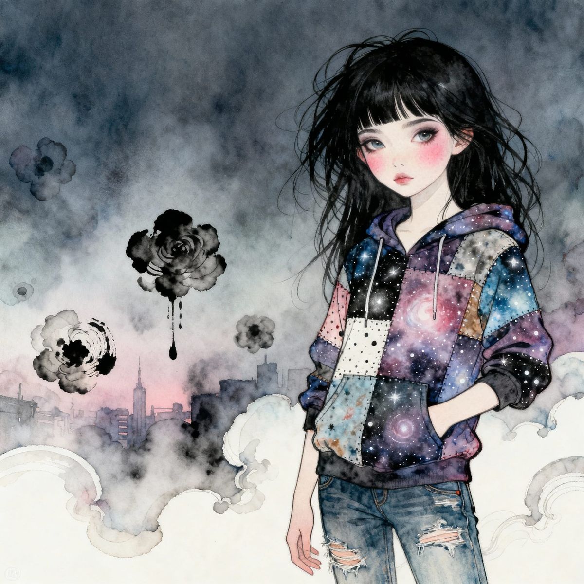 A pale woman with black hair gazes forward, wearing a galaxy hoodie. The image blends expressive linework with soft, ethereal tones, set against a dreamy urban mist.