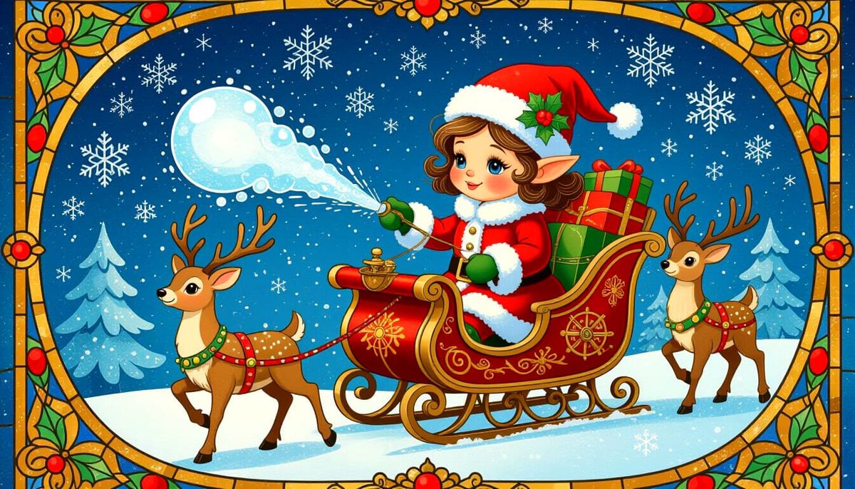 This image showcases a charming steampunk elf within a snow globe, depicted as a stained glass mosaic. The elf holds a snow-blowing mechanism, with reindeer pulling a sleigh.