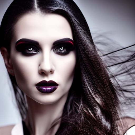 This image shows a hyperrealistic portrait of a brunette alternative model in gothic attire. The high contrast and cinematic lighting create an atmospheric and moody effect.