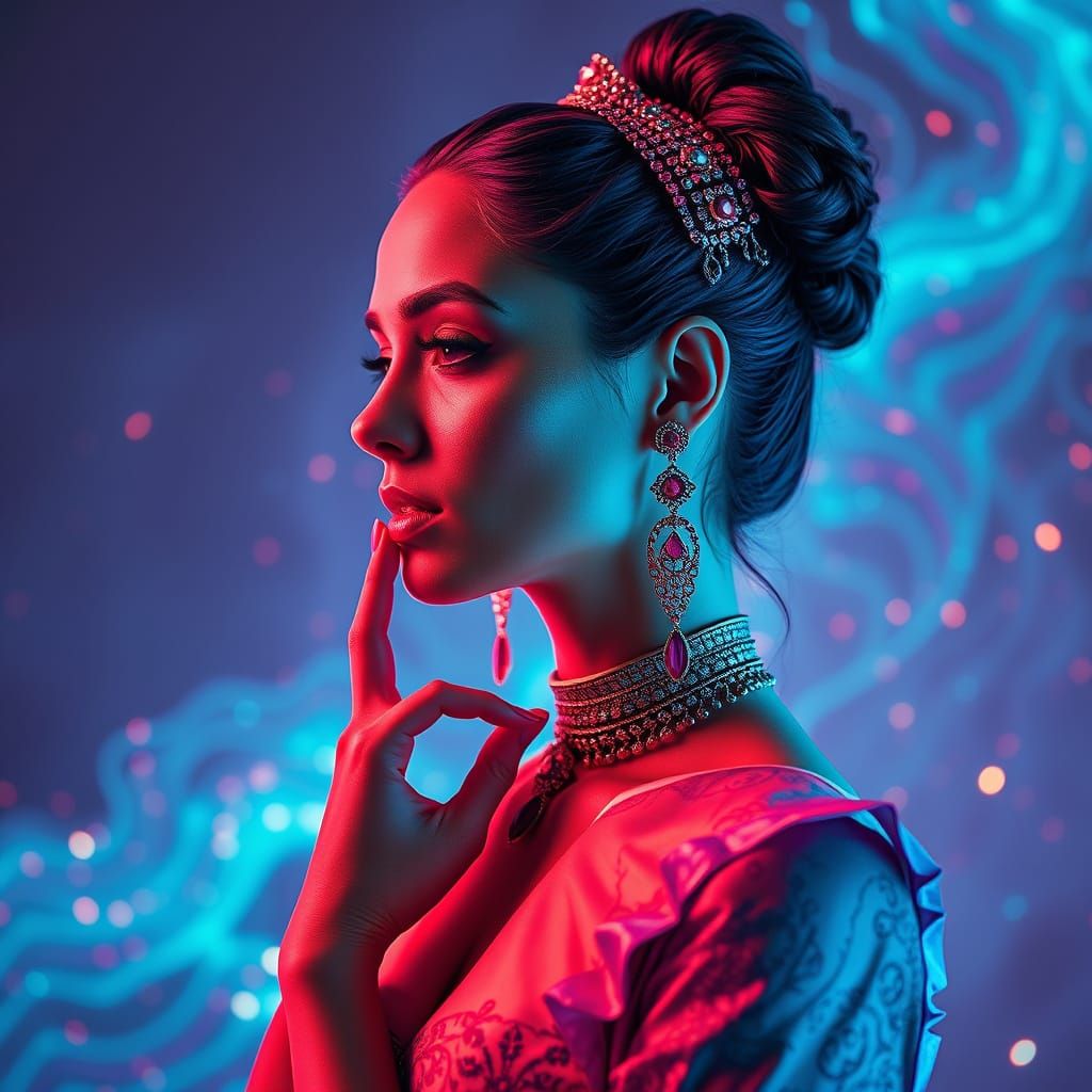 A striking picture of a woman in profile, elegantly dressed with detailed accessories. The portrait uses a droste effect and high resolution to create a futuristic and atmospheric aesthetic.