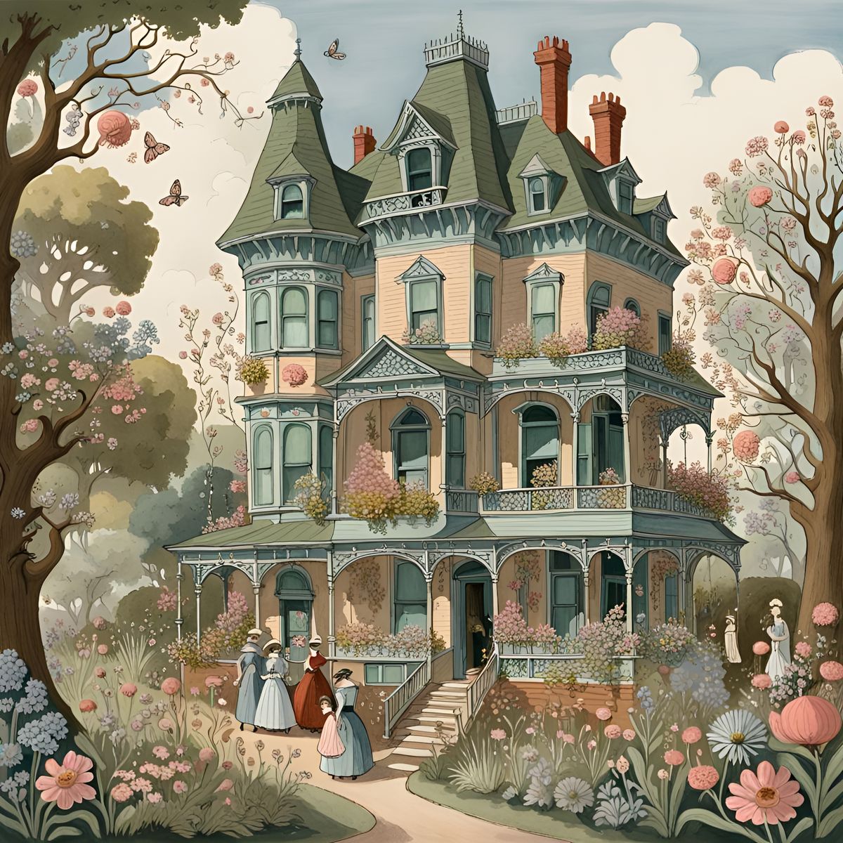 A vibrant image of a Victorian house teeming with activity. The gouache painting features people, fantastical flowers and biblical creatures in a whimsical, detailed style.