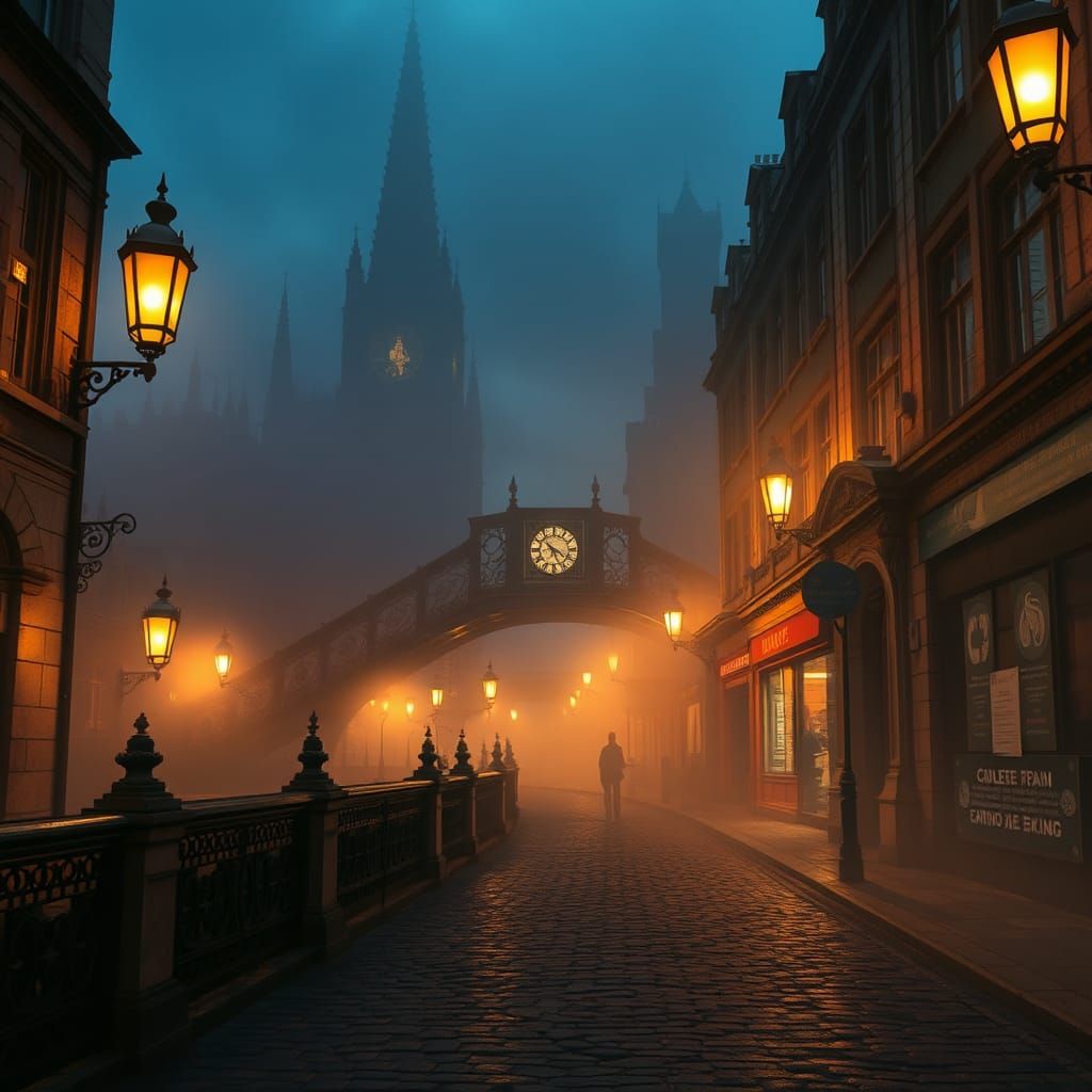 A captivating view of a misty London street at dusk with cobblestones and golden streetlights. Gothic architecture and mystical symbols create a foreboding atmosphere, rendered in 8k with cinematic quality.