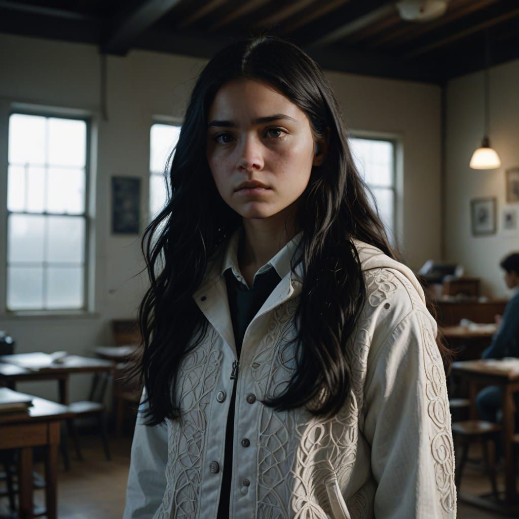 This hyperrealistic concept art shows a sorrowful 17-year-old American girl superhero student in a detailed white straitjacket. The cinematic image features dramatic backlighting and a somber, atmospheric mood.