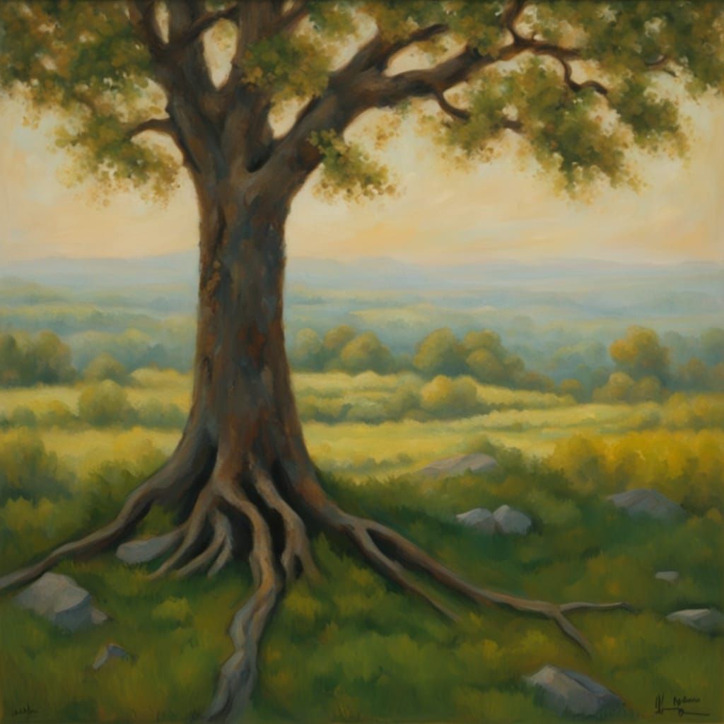 This oil painting captures a solitary sapling growing from cracked earth. Textured brushstrokes and warm, earthy tones create a charming, folk art feel with dappled sunlight.