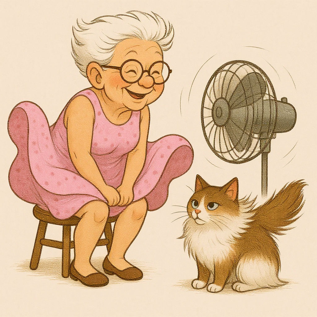 This image shows an elderly woman with short platinum hair sitting in front of a fan, her dress billowing in the breeze. A ragdoll cat sits beside her, its fur ruffled by the fan, in a heartwarming cartoon illustration.