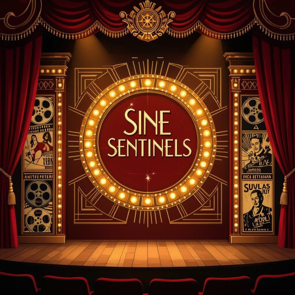 This image showcases a vintage cinema stage featuring maroon and gold tones, with 'Sine Sentinels' in an art deco font at its center. Detailed matte painting with cinematic lighting.