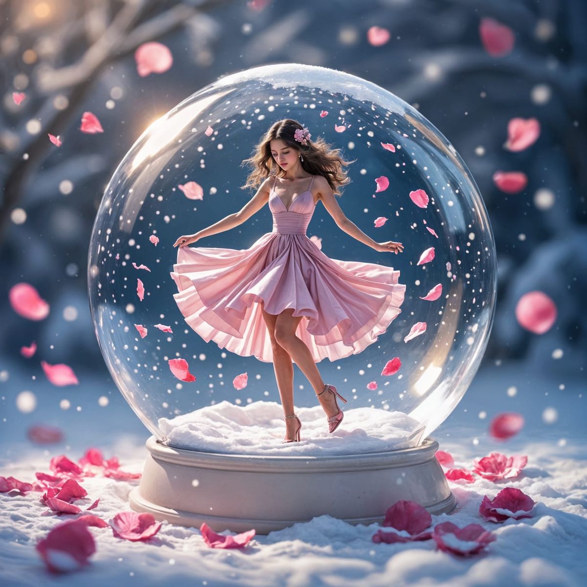 This image shows a beautiful woman in a pink dress dancing sensually inside a snow globe. The snow globe is filled with rose petals and falling snow.