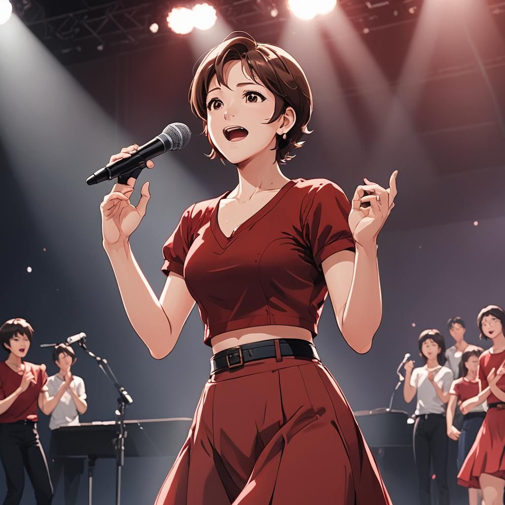 This image shows a mature woman with short brown hair, wearing a red crop top and skirt, singing on stage. The image is cel-shaded with cinematic lighting, in a manga scan style.