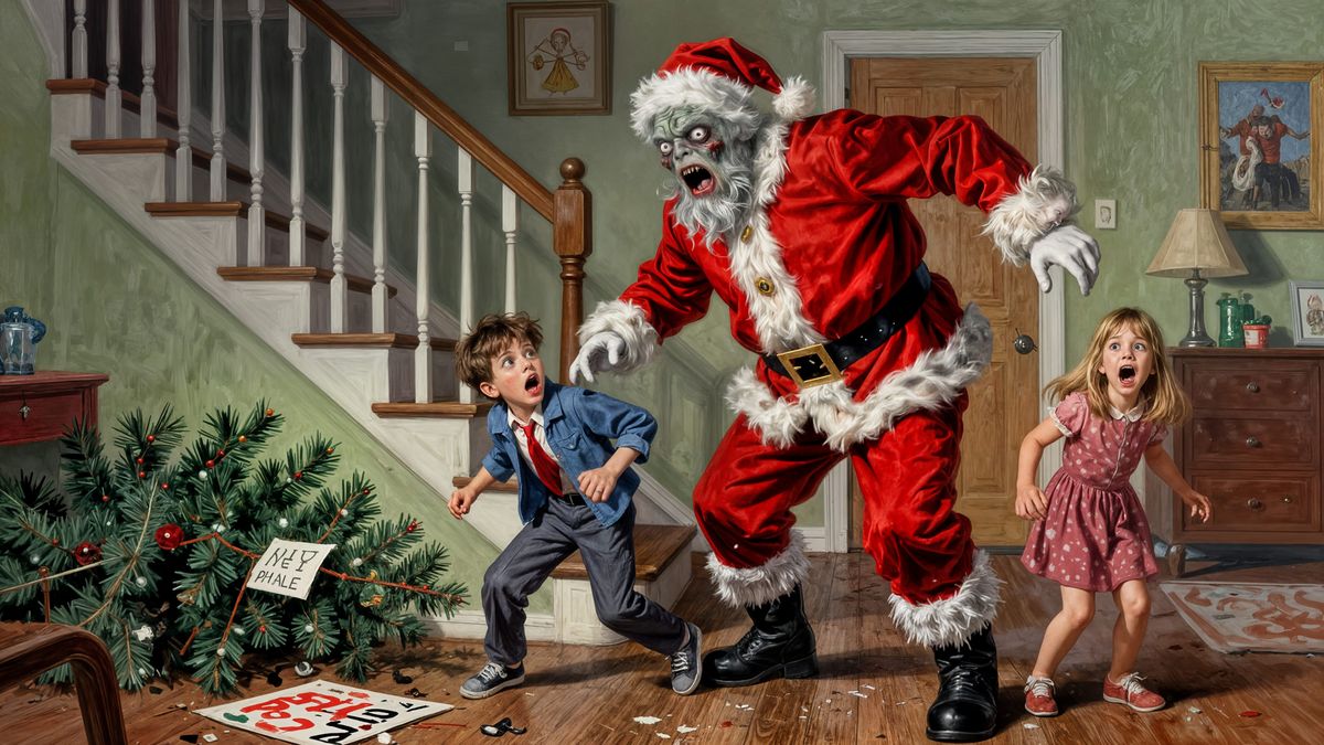 A dynamic acrylic painting depicts a terrifying zombie Santa Claus pursuing frightened children up stairs in a distressed 1950s suburban living room.