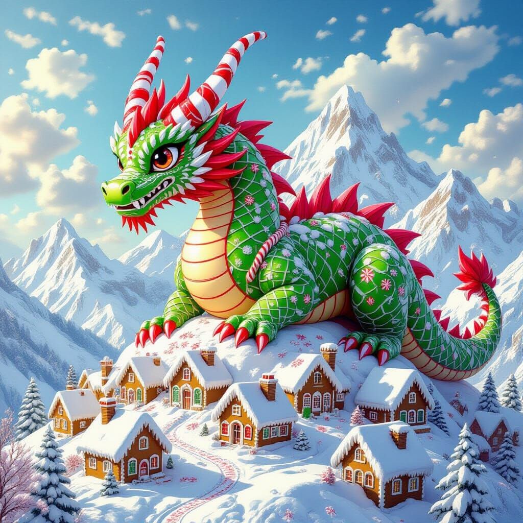 This image shows a candy cane dragon on a gingerbread mountain. The dragon's scales are peppermint candies, its eyes crystallized sugar, all rendered as hyperdetailed digital art.