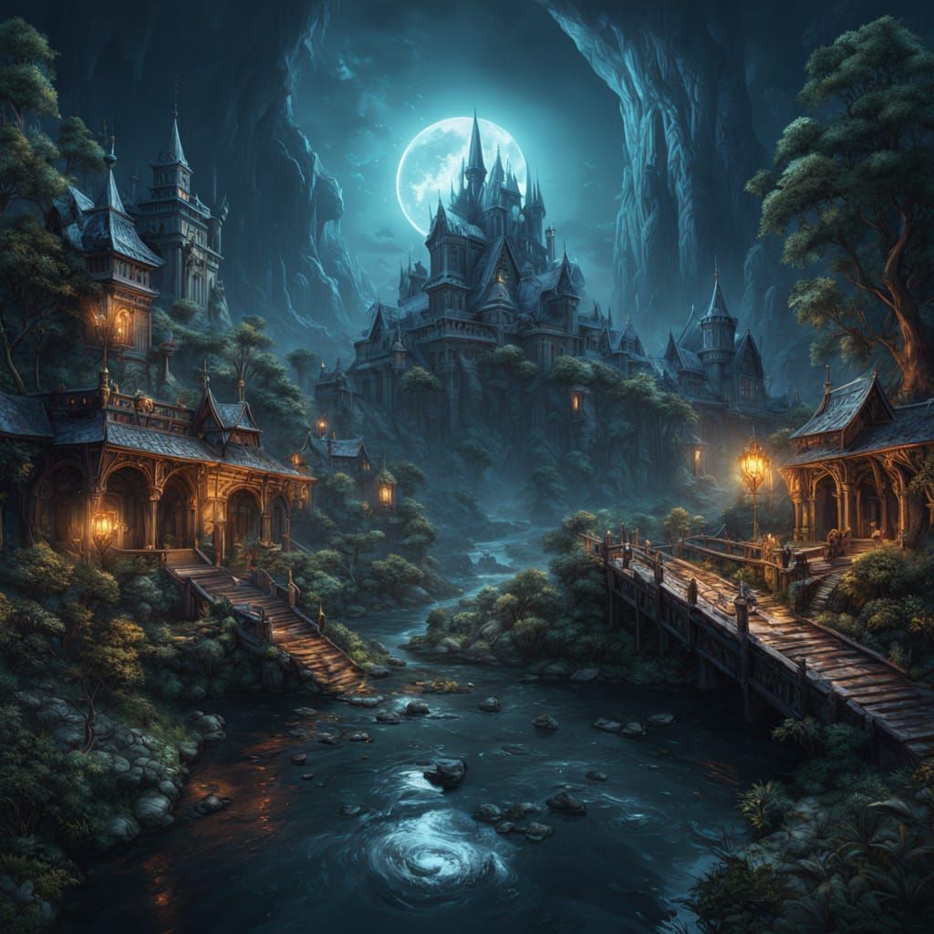This image depicts a fantastical portal opening on an alien world with three moons. Rendered with intricate detail and deep, complementary colors, it evokes a sense of wonder and adventure.