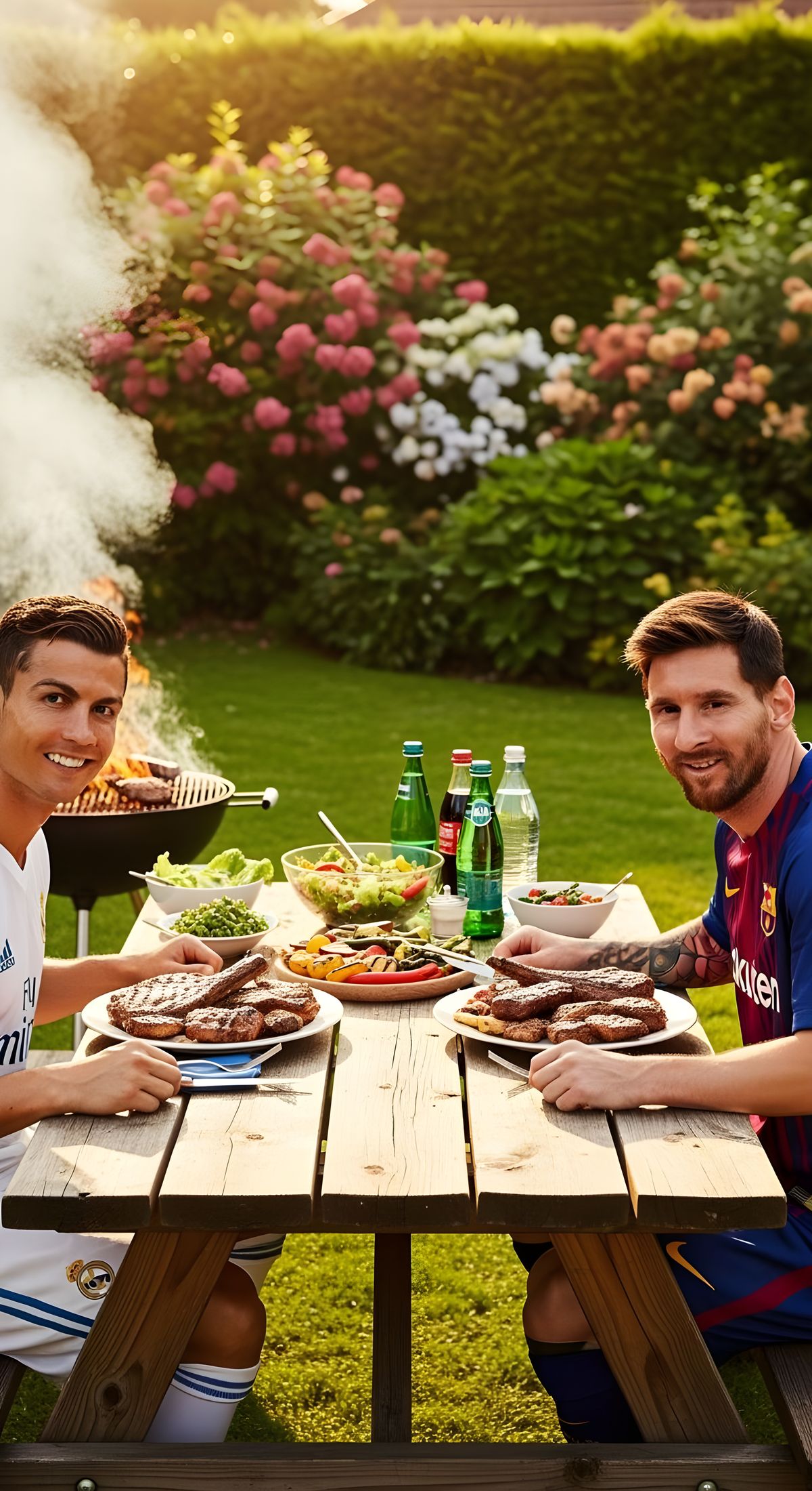 This image shows Ronaldo and Messi in their iconic jerseys at a backyard picnic. They are smiling, with grilled meat on plates, set against a backdrop of grass, a grill, and warm lighting.