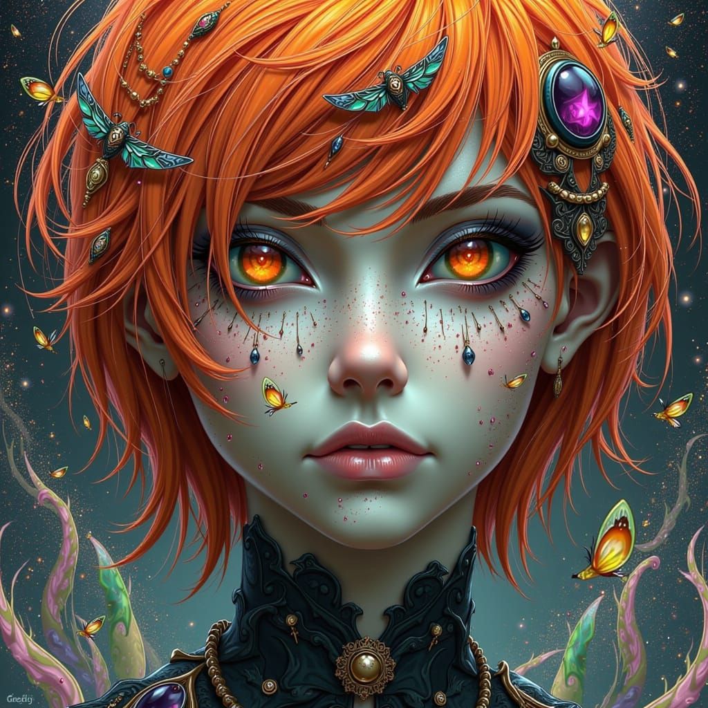 A striking gothic portrait of a melancholic young woman with short orange hair. The image blends abstract, post-punk, and tattoo art styles with dripped paint and swirling smoke.