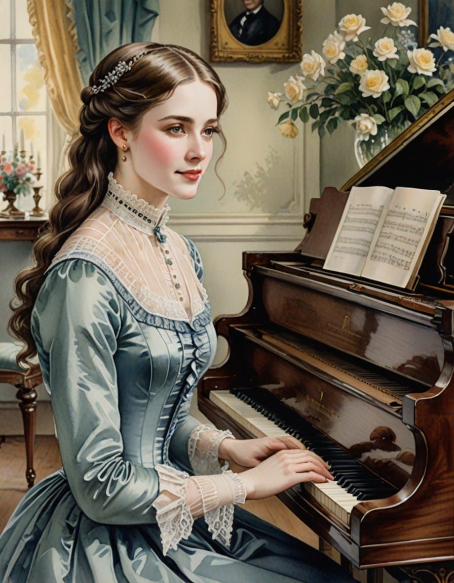 This image shows a Victorian woman with pale skin playing piano in a parlor, with a shy smile. The artwork is rendered as a delicate watercolor.