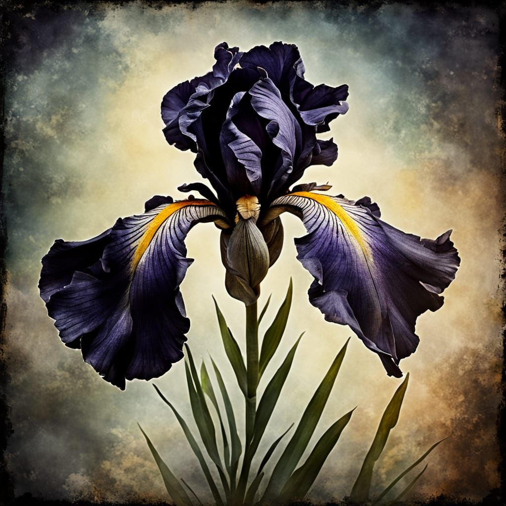This image shows a black iris flower with striking backlight and fraying edges, set against a grunge backdrop. The artwork is reminiscent of a vintage oil painting.