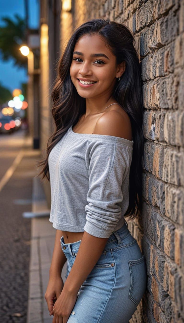 This image shows a 21-year-old Dominican woman in a vibrant urban setting. She is leaning against a wall and smiling, captured with dynamic lighting and intricate textures as digital art.