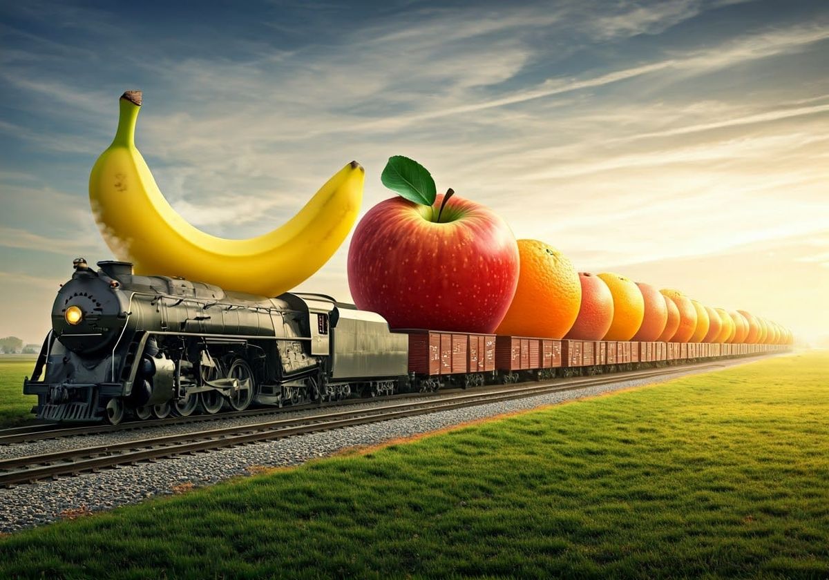 This image shows a vintage steam engine hauling oversized fruit through a misty landscape. The surreal scene is reminiscent of Impressionist paintings with highly detailed, photorealistic elements and a soft, romantic glow.