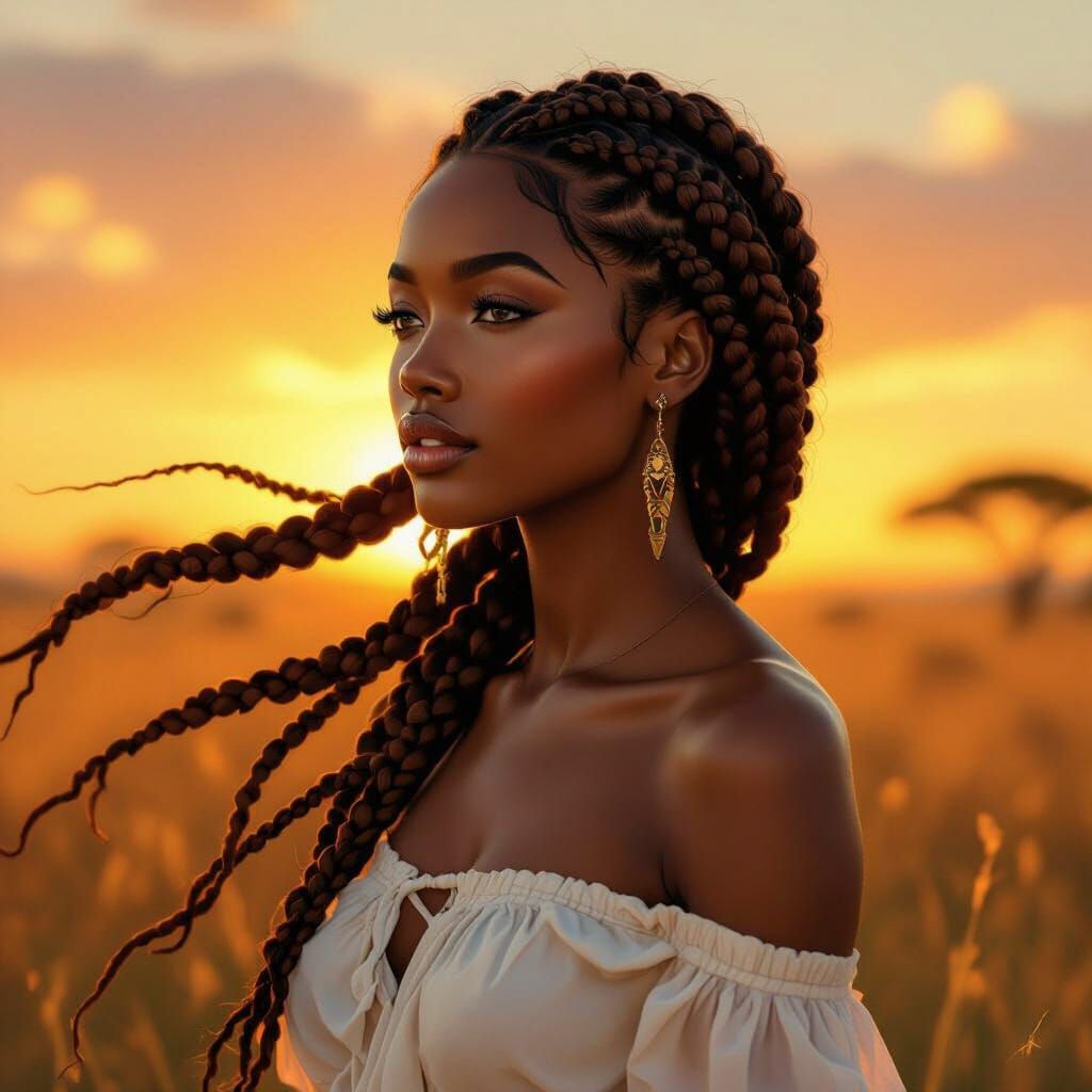 A graceful African woman with braided hair stands in a savanna sunset. Realistic digital painting with rich textures and dynamic lighting, highlighting her strength and natural beauty.