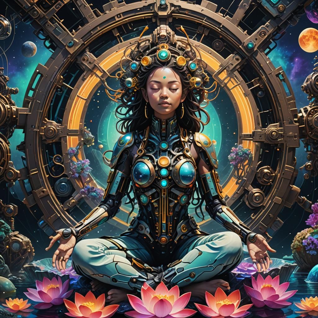 A striking picture of a woman in lotus pose floating in space. This fantasy concept art features a cosmic, psychedelic scene rendered with intricate details and a neon ambiance.