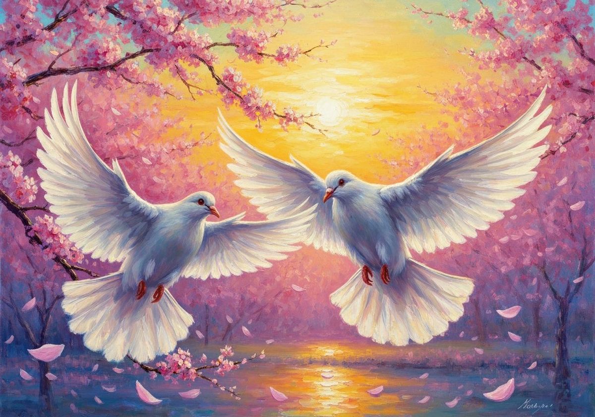 This image shows white doves flying through a blooming sakura landscape at sunrise. Painted in an Impressionist style with visible brushstrokes, it captures vibrant light and color.