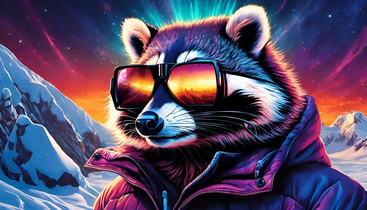 A raccoon spy wearing kaleidoscope glasses stands outside an isolated Antarctic science base. This ultra HD image features vibrant colors, intricate details, and a sense of fantasy and wonder.