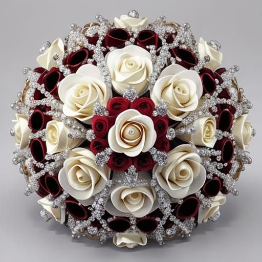 This image shows an opulent baroque-style bouquet. The arrangement features roses crafted from diamonds, rubies, and pearls, creating a luxurious and intricate design.