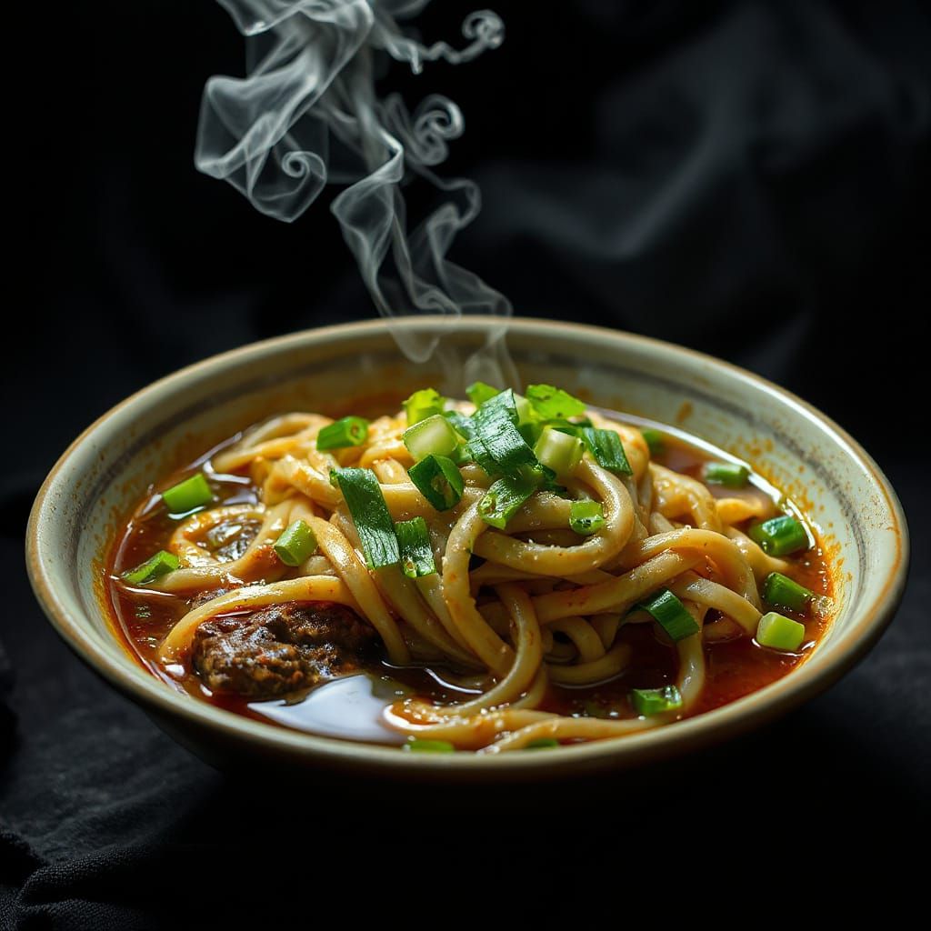 A bowl of steaming Cthulhu pasta ramen noodles with green onions and savory sauce. The image has a dark, mystical, and eerie atmosphere in a digital art style.