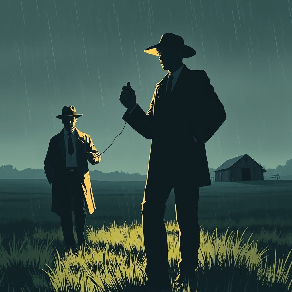 A dramatic wide-angle shot of a detective and scientist in a field. The scene is depicted in a 1950s comic book style, with light rain and a creepy atmosphere.