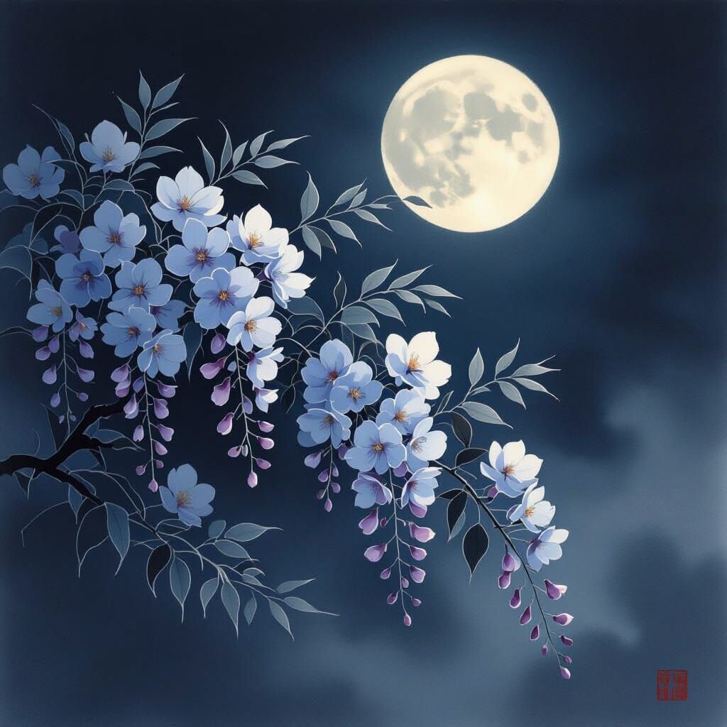 A Japanese ink wash painting in Yamato-e style, depicting fragile wisteria flowers in a breeze beneath a full moon. The art captures a sense of transience with subtle gradients and flowing brushstrokes, illuminated by ethereal moonlight.